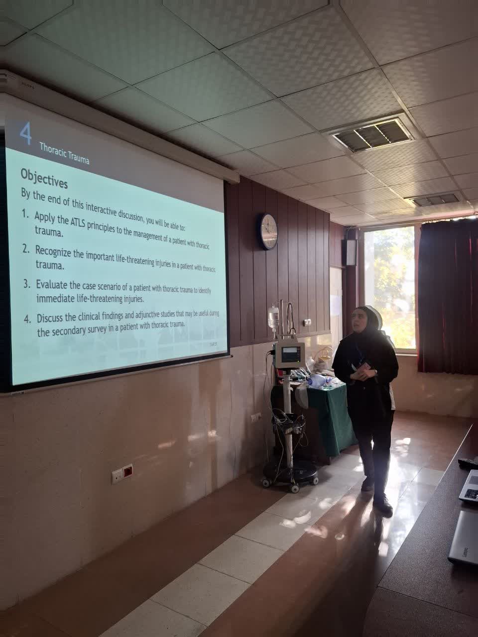همچنین گروهی از اساتید و اعضای هیئت علمی دکتر اعرابی، دکتر گرجانی، دکتر مهرنوش زهرایی، دکتر سید حسینی، دکتر فرهمندبه‌عنوان Instructor، مسئولیت آموزش و هدایت کارگاه‌ها را برعهده داشتند. در دو روز نخست، شرکت‌کنندگان با استفاده از مانکن‌ها، مولاژها و بیمار‌نماها، به تمرین پروسیجرهای تخصصی از جمله: راه هوایی، لاگرول، اتل‌بندی، CV line، Chest Tube، تراکئوستومی، Cut Down، مراقبت‌های زخم، استفاده از وسایل جراحی و تزریق Intraosseous پرداختند.