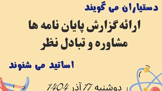 17 آذرماه؛ جلسه ارائه گزارش پایان نامه ها،مشاوره و تبادل نظر با عنوان دستیاران می گویند، اساتید می شنوند برگزار می شود.