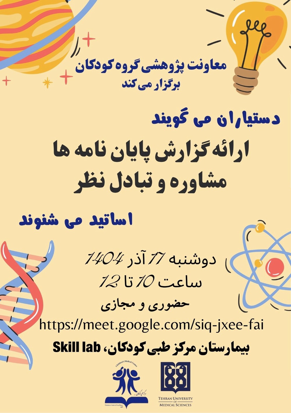 دانشکده پزشکی | به همت معاونت پژوهشی گروه کودکان برگزار می شود: جلسه ارائه گزارش پایان نامه ها،مشاوره و تبادل نظر