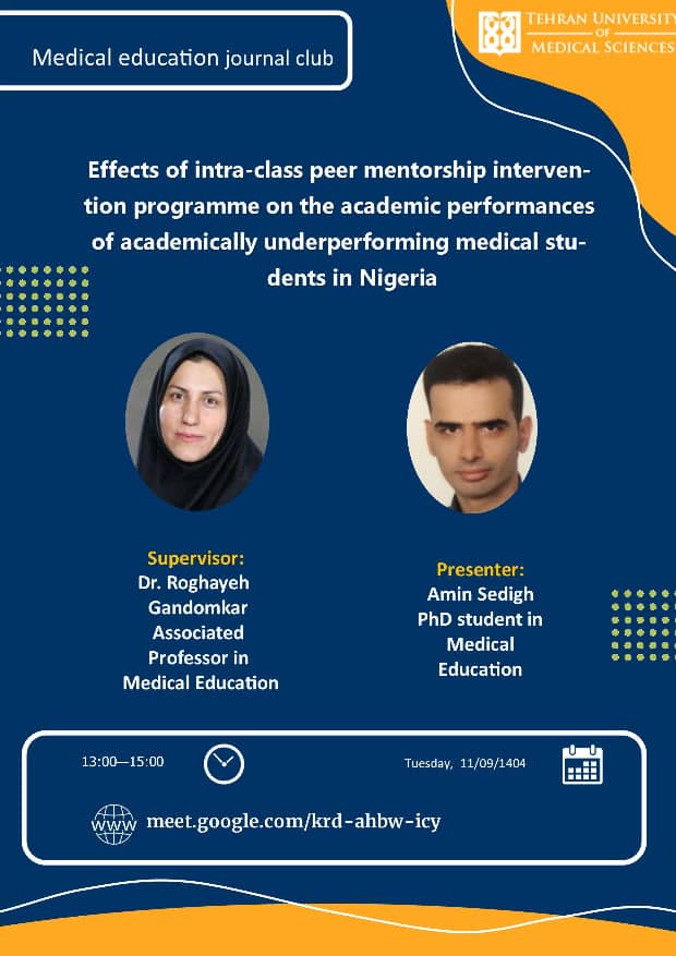 ژورنال کلاب گروه آموزش پزشکی با حضور و راهنمایی دکتر رقیه گندم کار استاد و امین صدیق دانشجوی دکترای تخصصی گروه آموزش پزشکی روز سه شنبه 11 آذر، ساعت 13 تا 15 به صورت مجازی در بستر گوگل میت برگزار خواهد شد.