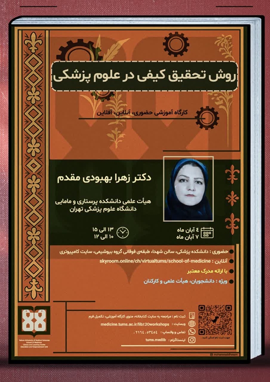 به گزارش روابط عمومی دانشکده پزشکی دانشگاه علوم پزشکی تهران؛ کارگاه روش تحقیق کیفی در علوم پزشکی با تدریس دکتر زهرا بهبودی مقدم هیأت علمی دانشکده پرستاری و مامایی دانشگاه علوم پزشکی تهران به سه روش آنلاین، حضوری و آفلاین در دو جلسه‌ی دو ساعته در روزهای یکشنبه 4 آبان ساعت 15تا13 و چهارشنبه 12تا10 برگزار می‌شود.